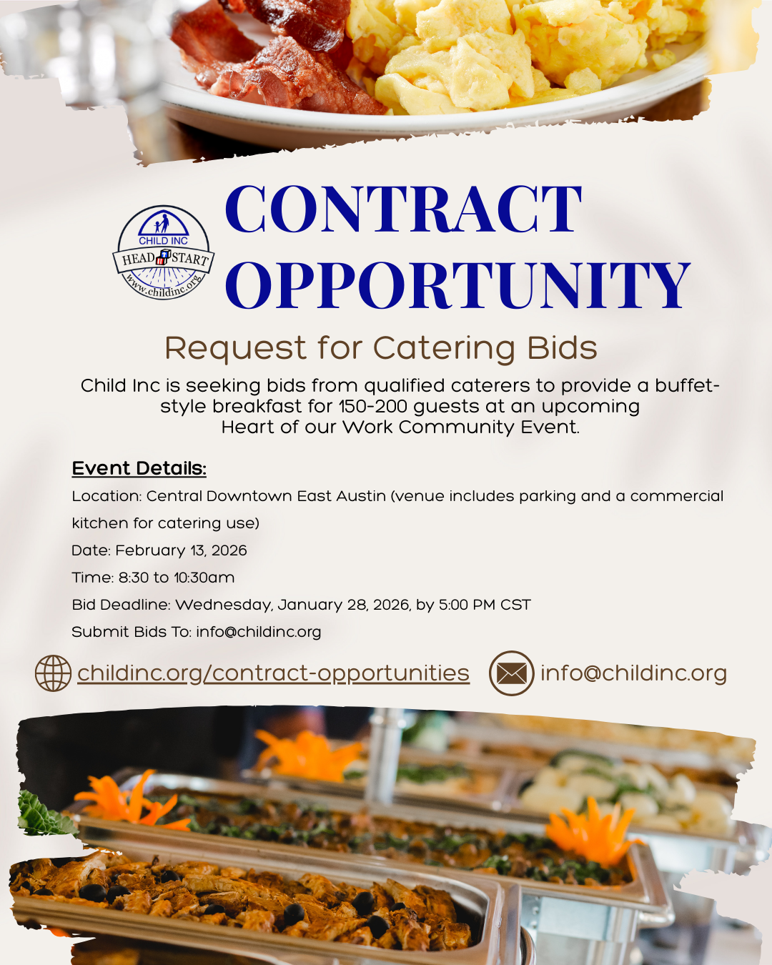 Child Inc Head Start is seeking bids from qualified caterers to provide a buffet-style breakfast for 150–200 guests at an upcoming Heart of our Work Community Event.